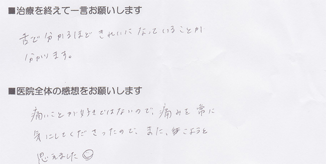 治療を終えて一言お願いします 舌でわかるほどきれいになっていることがわかります。 医院全体の感想をお願いします 痛いことが好きではないので、痛みを常に気にしてくださったので、またこようと思えました。